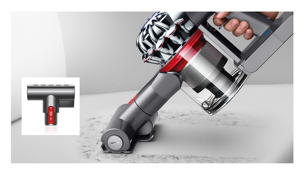 Your Dyson V8 vacuum is complete with a set of specialised tools, to remove dirt all over your home. They click on and off easily, with new quick-release catches.